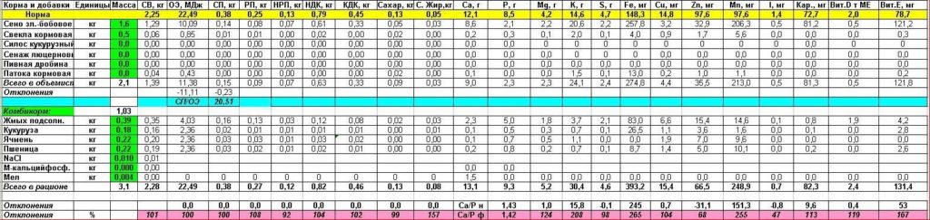 Пример рациона для коз (рацион лактирующей козы с живой массой 45 кг, суточный удой — 3,5 кг молока на 3-й неделе лактации)