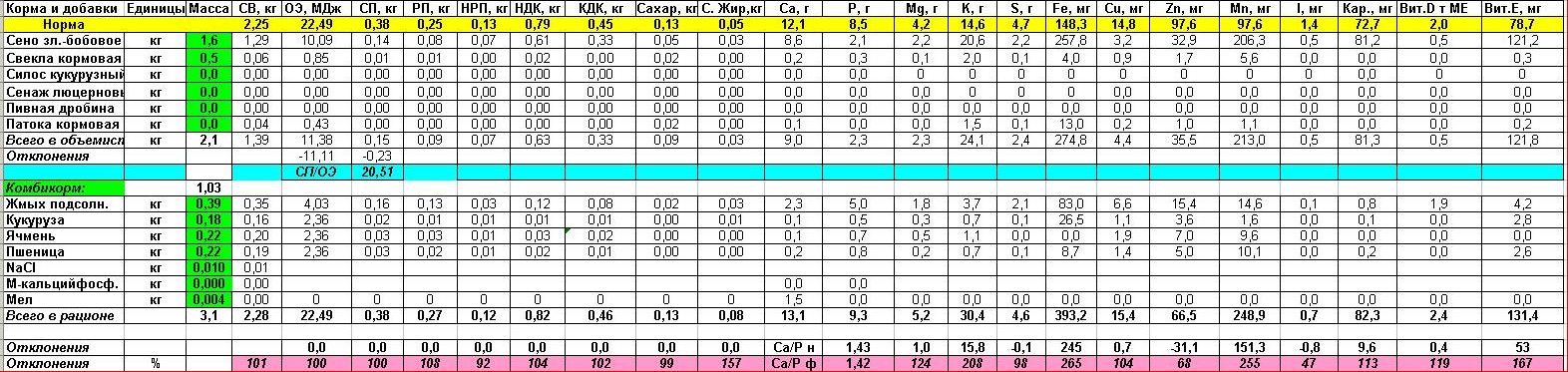 Пример рациона для коз (рацион лактирующей козы с живой массой 45 кг, суточный удой — 3,5 кг молока на 3-й неделе лактации)